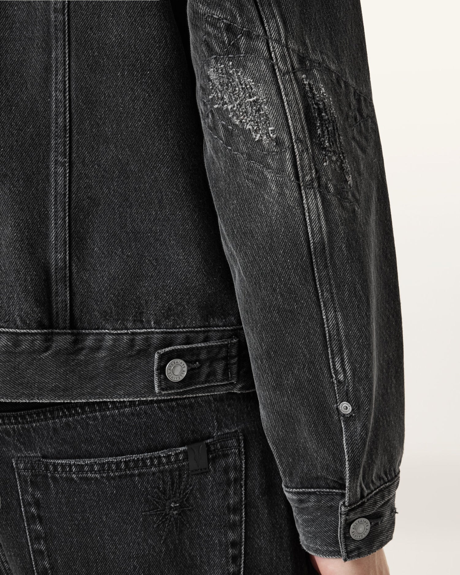 ג'קט ג'ינס לגברים מבית המותג אולסיינטס. בגזרת סלים, עם סגירת כפתורים לכל האורך, צווארון שטוח, כיס בחזה ושרוולים ארוכים.
